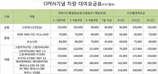 서울기풍렌트카 개업기념 대여가격 안내 페이지 정보 작성자 관리자 작성일14-07-19 09:48 조회3,171회 댓글0건 이전글 목록 본문 댓글목록 등록된 댓글이 없습니다. 이전글 목록